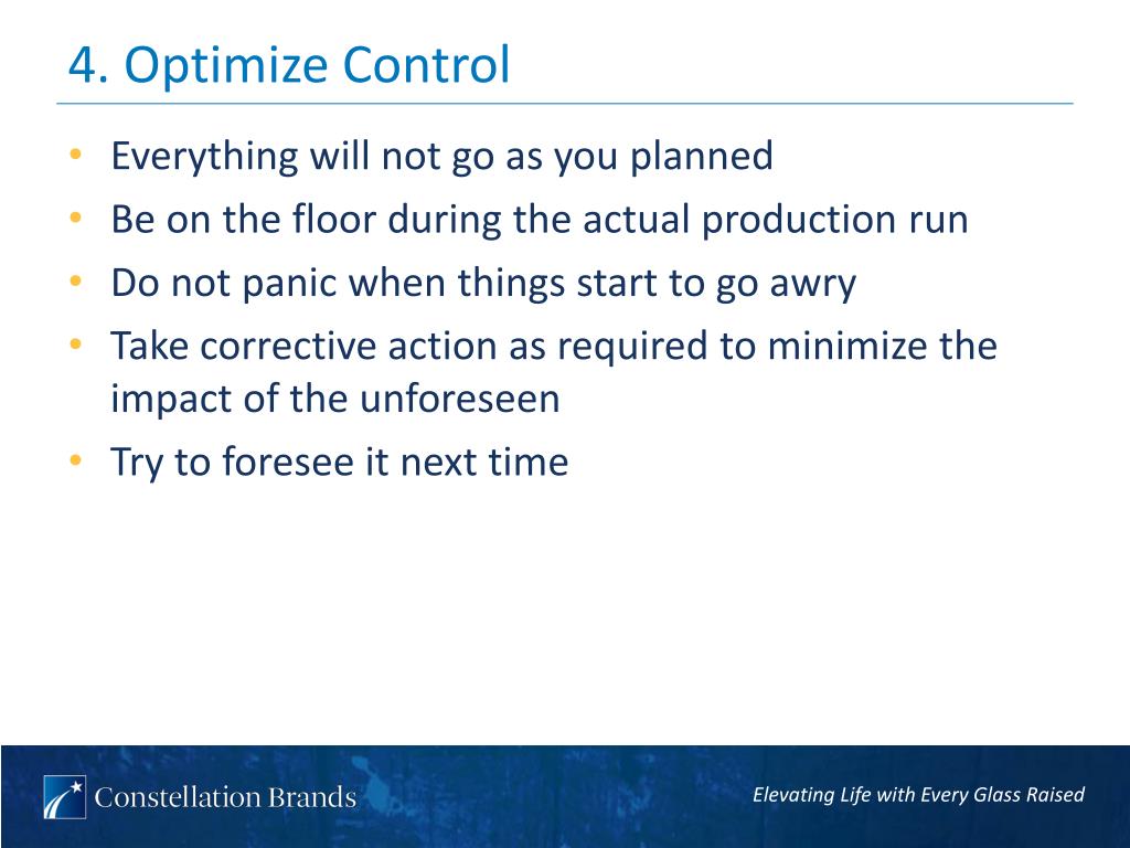 4. Optimize Control • Everything will not go as you planned • Be on the floor during the actual production run • Do not panic when things start to go awry • Take corrective action as required to minimize the impact of the unforeseen • Try to foresee it next time
