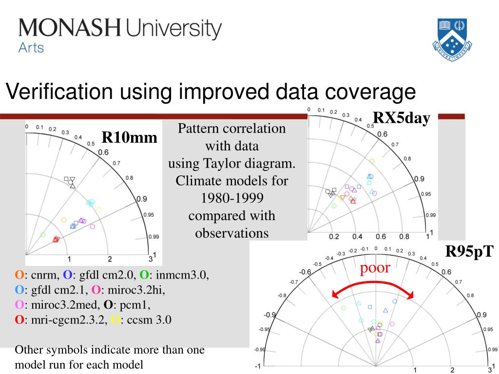 Verification using improved data coverage RX5day Pattern correlation with data using Taylor diagram. Climate models for 1980-1999 compared with observations R10mm R95pT poor O: cnrm, O: gfdl cm2.0, O: inmcm3.0, O: gfdl cm2.1, O: miroc3.2hi, O: miroc3.2med, O: pcm1, O: mri-cgcm2.3.2, O: ccsm 3.0 Other symbols indicate more than one model run for each model