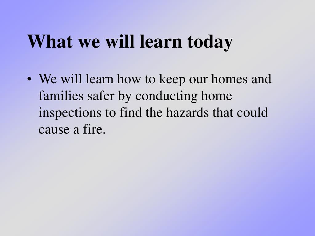 Home Fire Hazard Inspections. What we will learn today. We will learn how to keep our homes and families safer by conducting home inspections to find the hazards that could cause a fire. We have already learned:. What causes a fire What to do in a fire emergency