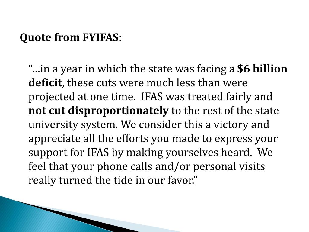 Quote from FYIFAS: “…in a year in which the state was facing a $6 billion deficit, these cuts were much less than were projected at one time. IFAS was treated fairly and not cut disproportionately to the rest of the state university system. We consider this a victory and appreciate all the efforts you made to express your support for IFAS by making yourselves heard. We feel that your phone calls and/or personal visits really turned the tide in our favor.”