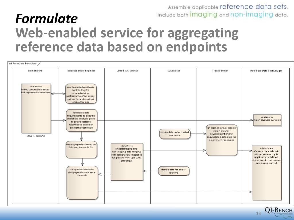 Commercial Sponsor Prepares Device/Test for Market Create and Manage Physical and Digital Reference Objects Consortium Establishes Clinical Utility/Efficacy of Putative Biomarker Create and Manage Semantic Infrastructure and Linked Data Archives Core Activities for Biomarker Development QISL Quantitative Imaging Specification Language Reference Data Set Manager 3. Batch analysis scripts QIBO Reference Data Sets, Annotations, and Analysis Results Source of clinical study results Collaborative Activities to Standardize and/or Optimize the Biomarker UPICT Protocols, QIBA Profiles, entered with Ruby on Rails web service Batch Analysis Service Clinical Body of Evidence (formatted to enable SDTM and/or other standardized registrations 4. Output QIBO- UPICT Protocols, QIBA Profiles, literature papers and other sources (red edges represent biostatistical generalizability) BatchMake Scripts 5