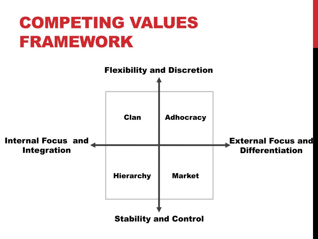 Competing Values Framework Flexibility and Discretion Internal Focus and Integration External Focus and Differentiation Clan Adhocracy Hierarchy Market Stability and Control