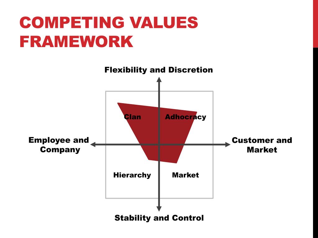 Competing Values Framework Flexibility and Discretion Clan Adhocracy Employee and Company Customer and Market Hierarchy Market Stability and Control