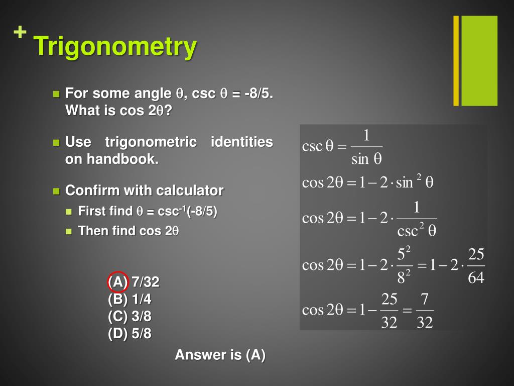 For some angle q, cscq = -8/5. What is cos 2q? Use trigonometric identities on handbook. Confirm with calculator First find q = csc-1(-8/5) Then find cos 2q Trigonometry (A) 7/32 (B) 1/4 (C) 3/8 (D) 5/8 Answer is (A)