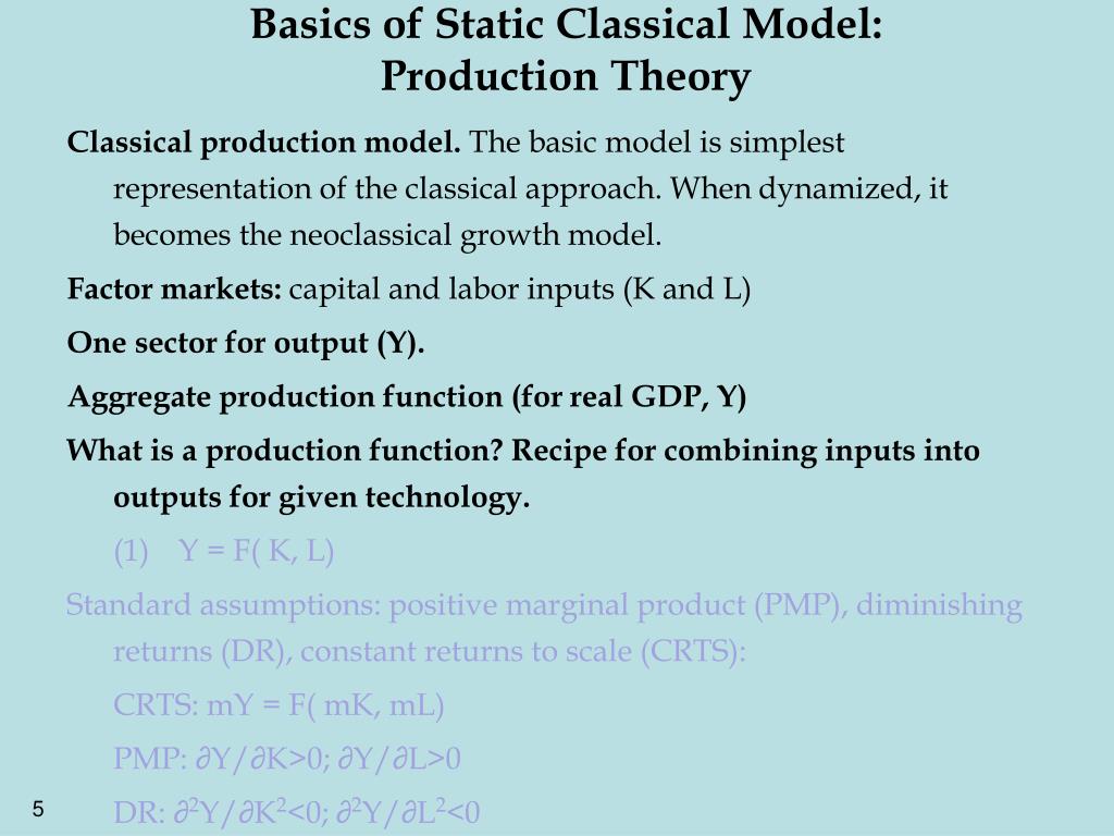 Basics of Static Classical Model: Production Theory Classical production model. The basic model is simplest representation of the classical approach. When dynamized, it becomes the neoclassical growth model. Factor markets: capital and labor inputs (K and L) One sector for output (Y). Aggregate production function (for real GDP, Y) (1) Y = F( K, L) Standard assumptions: positive marginal product (PMP), diminishing returns (DR), constant returns to scale (CRTS): CRTS: mY = F( mK, mL) PMP: ∂Y/∂K>0; ∂Y/∂L>0 DR: ∂2Y/∂K2<0; ∂2Y/∂L2<0