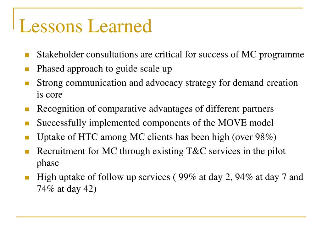 Lessons Learned • Stakeholder consultations are critical for success of MC programme • Phased approach to guide scale up • Strong communication and advocacy strategy for demand creation is core • Recognition of comparative advantages of different partners • Successfully implemented components of the MOVE model • Uptake of HTC among MC clients has been high (over 98%) • Recruitment for MC through existing T&C services in the pilot phase • High uptake of follow up services ( 99% at day 2, 94% at day 7 and 74% at day 42)
