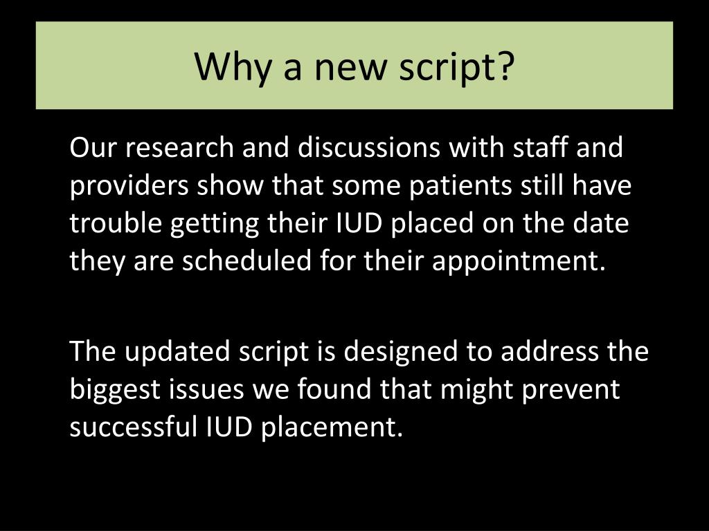 Why a new script? Our research and discussions with staff and providers show that some patients still have trouble getting their IUD placed on the date they are scheduled for their appointment. The updated script is designed to address the biggest issues we found that might prevent successful IUD placement.