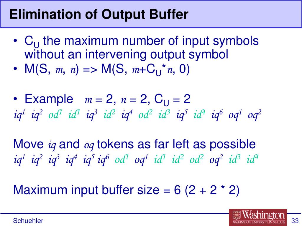 Elimination of Output Buffer • CU the maximum number of input symbols without an intervening output symbol • M(S, m, n) => M(S, m+CU*n, 0) • Example m = 2, n = 2, CU = 2 iq1 iq2od1 id1 iq3id2 iq4od2 id3iq5id4 iq6 oq1 oq2 Move iq and oq tokens as far left as possible iq1 iq2 iq3 iq4 iq5 iq6od1oq1 id1id2od2oq2 id3 id4 Maximum input buffer size = 6 (2 + 2 * 2)