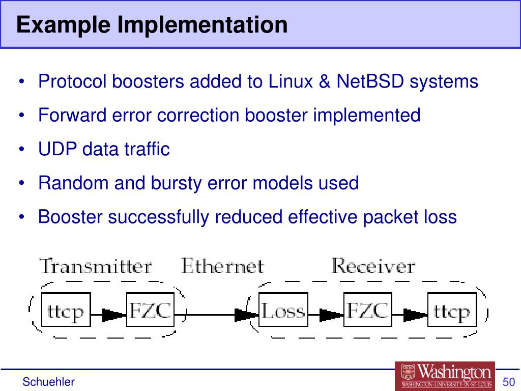 Example Implementation Protocol boosters added to Linux & NetBSD systems Forward error correction booster implemented UDP data traffic Random and bursty error models used Booster successfully reduced effective packet loss