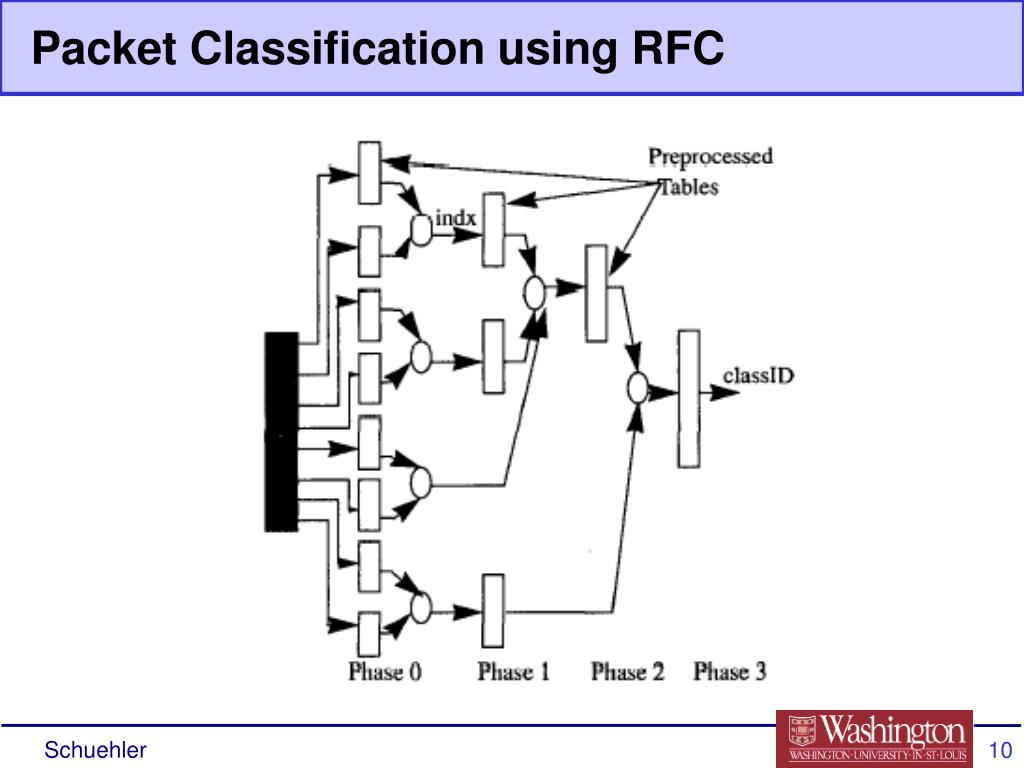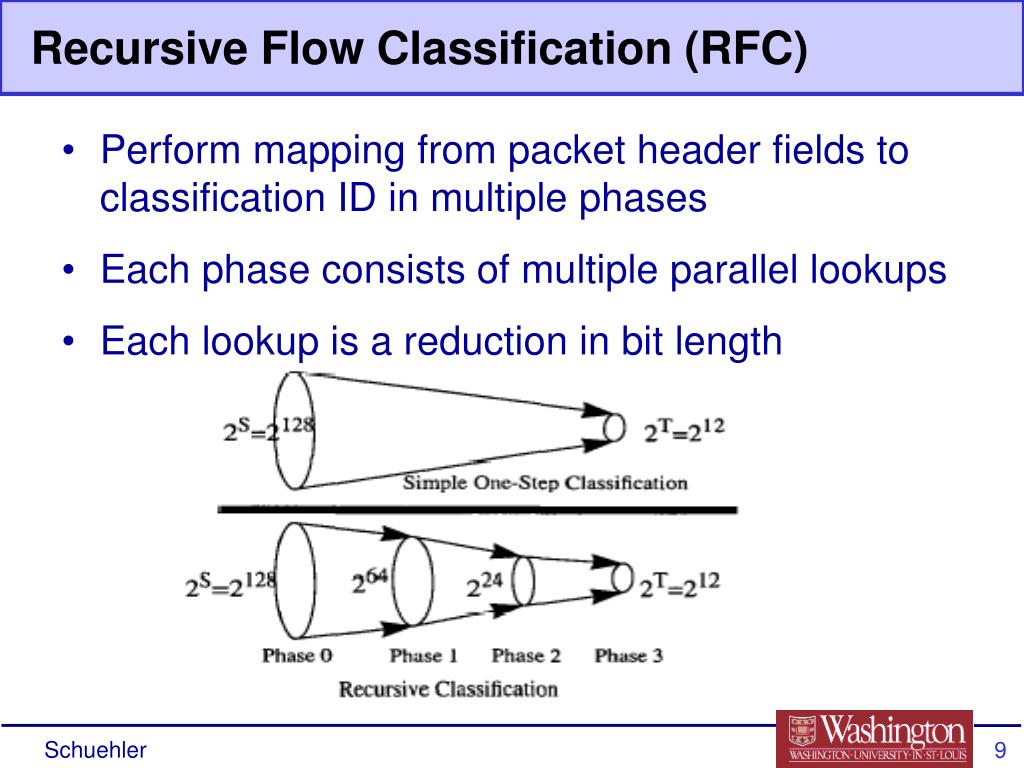 Recursive Flow Classification (RFC) Perform mapping from packet header fields to classification ID in multiple phases Each phase consists of multiple parallel lookups Each lookup is a reduction in bit length