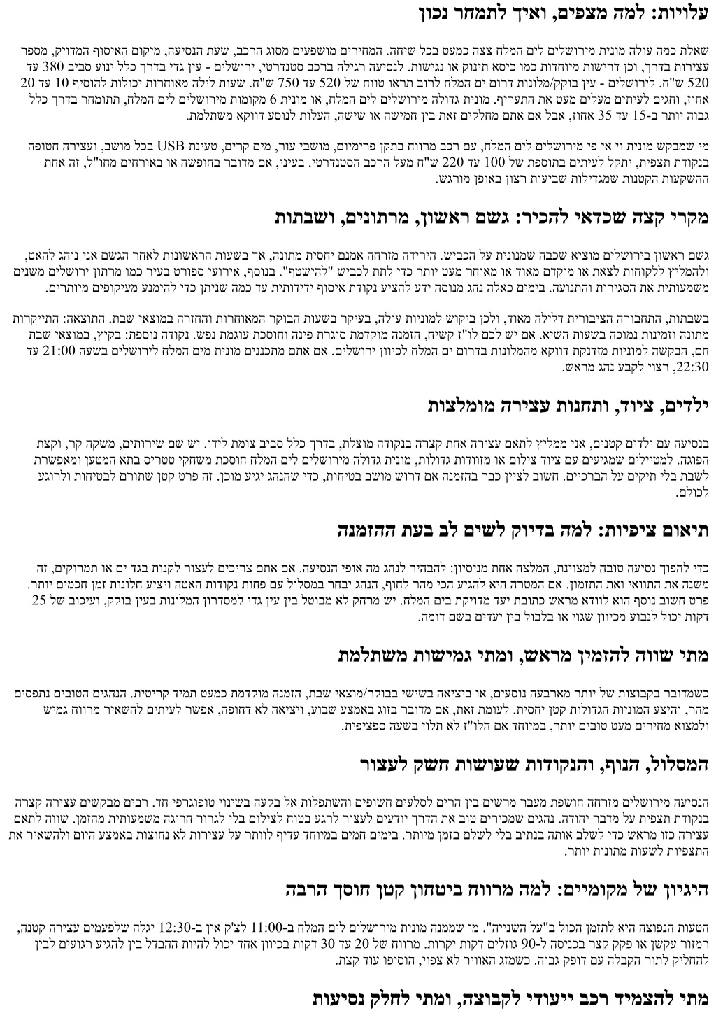ןוכנ רחמתל ךיאו ,םיפצמ המל :תויולע רפסמ ,קיודמה ףוסיאה םוקימ ,העיסנה תעש ,בכרה גוסמ םיעפשומ םיריחמה .החיש לכב טעמכ הצצ חלמה םיל םילשורימ תינומ הלוע המכ תלאש דע 380 ביבס עוני ללכ ךרדב ידג ןיע - םילשורי ,יטרדנטס בכרב הליגר העיסנל .תושיגנ וא קונית אסיכ ומכ תודחוימ תושירד ןכו ,ךרדב תוריצע 20 דע 10 ףיסוהל תולוכי תורחואמ הליל תועש .ח"ש 750 דע 520 לש חווט וארת בורל חלמה םי םורד תונולמ/קקוב ןיע - םילשוריל .ח"ש 520 ללכ ךרדב רחמותת ,חלמה םיל םילשורימ תומוקמ 6 תינומ וא ,חלמה םיל םילשורימ הלודג תינומ .ףירעתה תא טעמ םילעמ םיתיעל םיגחו ,זוחא .תמלתשמ אקווד עסונל תולעה ,השיש וא השימח ןיב תאז םיקלחמ םתא םא לבא ,זוחא 35 דע 15-ב רתוי הובג הפוטח הריצעו ,בשומ לכב USB תניעט ,םירק םימ ,רוע יבשומ ,םוימירפ ןקתב חוורמ בכר םע ,חלמה םיל םילשורימ יפ יא יו תינומ שקבמש ימ תחא הז ,ל"וחמ םיחרואב וא השפוחב רבודמ םא ,יניעב .יטרדנטסה בכרה לעמ ח"ש 220 דע 100 לש תפסותב םיתיעל לקתי ,תיפצת תדוקנב .שגרומ ןפואב ןוצר תועיבש תולידגמש תונטקה תועקשהה תותבשו ,םינותרמ ,ןושאר םשג :ריכהל יאדכש הצק ירקמ ,טאהל גהונ ינא םשגה רחאל תונושארה תועשב ךא ,הנותמ תיסחי םנמא החרזמ הדיריה .שיבכה לע תינונמש הבכש איצומ םילשוריב ןושאר םשג םינשמ םילשורי ןותרמ ומכ ריעב טרופס יעוריא ,ףסונב ."ףטשיהל" שיבכל תתל ידכ רתוי טעמ רחואמ וא דואמ םדקומ וא תאצל תוחוקלל ץילמהלו .םירתוימ םיפוקיעמ ענמיהל ידכ ןתינש המכ דע תיתודידי ףוסיא תדוקנ עיצהל עדי הסונמ גהנ הלאכ םימיב .העונתהו תוריגסה תא תיתועמשמ תורקייתה :האצותה .תבש יאצומב הרזחהו תורחואמה רקובה תועשב רקיעב ,הלוע תוינומל שוקיב ןכלו ,דואמ הלילד תירוביצה הרובחתה ,תותבשב תבש יאצומב ,ץיקב :תפסונ הדוקנ .שפנ תמגוע תכסוחו הניפ תרגוס תמדקומ הנמזה ,חישק ז"ול םכל שי םא .אישה תועשב הכומנ תונימזו הנותמ דע 21:00 העשב םילשוריל חלמה םימ תינומ םיננכתמ םתא םא .םילשורי ןוויכל חלמה םי םורדב תונולמהמ אקווד תקנדזמ תוינומל השקבה ,םח .שארמ גהנ עבקל יוצר ,22:30 תוצלמומ הריצע תונחתו ,דויצ ,םידלי תצקו ,רק הקשמ ,םיתוריש םש שי .ודיל תמוצ ביבס ללכ ךרדב ,תלצומ הדוקנב הרצק תחא הריצע םאתל ץילממ ינא ,םינטק םידלי םע העיסנב תרשפאמו ןעטמה אתב סירטט יקחשמ תכסוח חלמה םיל םילשורימ הלודג תינומ ,תולודג תודווזמ וא םוליצ דויצ םע םיעיגמש םילייטמל .הגופה עגורלו תוחיטבל םרותש ןטק טרפ הז .ןכומ עיגי גהנהש ידכ ,תוחיטב בשומ שורד םא הנמזהב רבכ ןייצל בושח .םייכרבה לע םיקית ילב תבשל .םלוכל הנמזהה תעב בל םישל קוידב המל :תויפיצ םואית הז ,םיקורמת וא םי דגב תונקל רוצעל םיכירצ םתא םא .העיסנה יפוא המ גהנל ריהבהל :ןויסינמ תחא הצלמה ,תניוצמל הבוט העיסנ ךופהל ידכ .רתוי םימכח ןמז תונולח עיציו הטאה תודוקנ תוחפ םע לולסמב רחבי גהנה ,ףוחל רהמ יכה עיגהל איה הרטמה םא .ןומזתה תאו יאוותה תא הנשמ 25 לש בוכיעו ,קקוב ןיעב תונולמה ןורדסמל ידג ןיע ןיב לטובמ אל קחרמ שי .חלמה םיב תקיודמ דעי תבותכ שארמ אדוול אוה ףסונ בושח טרפ .המוד םשב םידעי ןיב לובלב וא יוגש ןוויכמ עובנל לוכי תוקד תמלתשמ תושימג יתמו ,שארמ ןימזהל הווש יתמ םיספתנ םיבוטה םיגהנה .תיטירק דימת טעמכ תמדקומ הנמזה ,תבש יאצומ/רקובב ישישב האיציב וא ,םיעסונ העבראמ רתוי לש תוצובקב רבודמשכ שימג חוורמ ריאשהל םיתיעל רשפא ,הפוחד אל האיציו ,עובש עצמאב גוזב רבודמ םא ,תאז תמועל .תיסחי ןטק תולודגה תוינומה עציהו ,רהמ .תיפיצפס העשב יולת אל ז"ולה םא דחוימב ,רתוי םיבוט טעמ םיריחמ אוצמלו רוצעל קשח תושועש תודוקנהו ,ףונה ,לולסמה הרצק הריצע םישקבמ םיבר .דח יפרגופוט יונישב העקב לא תולפתשהו םיפושח םיעלסל םירה ןיב םישרמ רבעמ תפשוח החרזמ םילשורימ העיסנה םאתל הווש .ןמזהמ תיתועמשמ הגירח רורגל ילב םוליצל חוטב עגרל רוצעל םיעדוי ךרדה תא בוט םיריכמש םיגהנ .הדוהי רבדמ לע תיפצת תדוקנב תא ריאשהלו םויה עצמאב תוצוחנ אל תוריצע לע רתוול ףידע דחוימב םימח םימיב .רתוימ ןמזב םלשל ילב ביתנב התוא בלש
