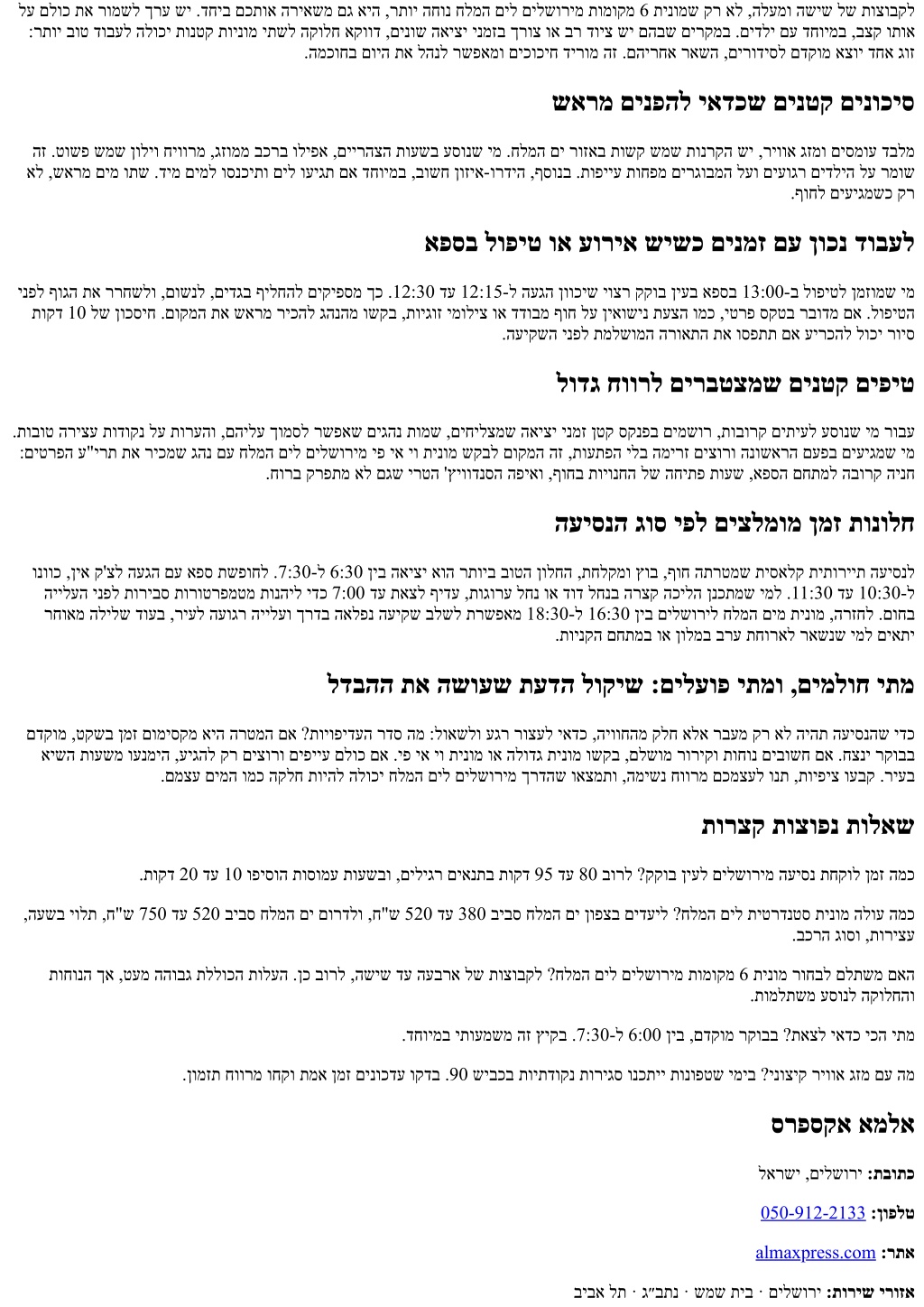 לע םלוכ תא רומשל ךרע שי .דחיב םכתוא הריאשמ םג איה ,רתוי החונ חלמה םיל םילשורימ תומוקמ 6 תינומש קר אל ,הלעמו השיש לש תוצובקל :רתוי בוט דובעל הלוכי תונטק תוינומ יתשל הקולח אקווד ,םינוש האיצי ינמזב ךרוצ וא בר דויצ שי םהבש םירקמב .םידלי םע דחוימב ,בצק ותוא .המכוחב םויה תא להנל רשפאמו םיכוכיח דירומ הז .םהירחא ראשה ,םירודיסל םדקומ אצוי דחא גוז שארמ םינפהל יאדכש םינטק םינוכיס הז .טושפ שמש ןוליו חיוורמ ,גזוממ בכרב וליפא ,םיירהצה תועשב עסונש ימ .חלמה םי רוזאב תושק שמש תונרקה שי ,ריווא גזמו םיסמוע דבלמ אל ,שארמ םימ ותש .דימ םימל וסנכיתו םיל ועיגת םא דחוימב ,בושח ןוזיא-ורדיה ,ףסונב .תופייע תוחפמ םירגובמה לעו םיעוגר םידליה לע רמוש .ףוחל םיעיגמשכ קר אפסב לופיט וא עוריא שישכ םינמז םע ןוכנ דובעל ינפל ףוגה תא ררחשלו ,םושנל ,םידגב ףילחהל םיקיפסמ ךכ .12:30 דע 12:15-ל העגה ןווכיש יוצר קקוב ןיעב אפסב 13:00-ב לופיטל ןמזומש ימ תוקד 10 לש ןוכסיח .םוקמה תא שארמ ריכהל גהנהמ ושקב ,תויגוז ימוליצ וא דדובמ ףוח לע ןיאושינ תעצה ומכ ,יטרפ סקטב רבודמ םא .לופיטה .העיקשה ינפל תמלשומה הרואתה תא וספתת םא עירכהל לוכי רויס לודג חוורל םירבטצמש םינטק םיפיט .תובוט הריצע תודוקנ לע תורעהו ,םהילע ךומסל רשפאש םיגהנ תומש ,םיחילצמש האיצי ינמז ןטק סקנפב םימשור ,תובורק םיתיעל עסונש ימ רובע :םיטרפה ע"ירת תא ריכמש גהנ םע חלמה םיל םילשורימ יפ יא יו תינומ שקבל םוקמה הז ,תועתפה ילב המירז םיצורו הנושארה םעפב םיעיגמש ימ .חורב קרפתמ אל םגש ירטה 'ץיוודנסה הפיאו ,ףוחב תויונחה לש החיתפ תועש ,אפסה םחתמל הבורק הינח העיסנה גוס יפל םיצלמומ ןמז תונולח ונווכ ,ןיא ק'צל העגה םע אפס תשפוחל .7:30-ל 6:30 ןיב האיצי אוה רתויב בוטה ןולחה ,תחלקמו ץוב ,ףוח התרטמש תיסאלק תיתוריית העיסנל היילעה ינפל תוריבס תורוטרפמטמ תונהיל ידכ 7:00 דע תאצל ףידע ,תוגורע לחנ וא דוד לחנב הרצק הכילה ןנכתמש ימל .11:30 דע 10:30-ל רחואמ הלילש דועב ,ריעל העוגר היילעו ךרדב האלפנ העיקש בלשל תרשפאמ 18:30-ל 16:30 ןיב םילשוריל חלמה םימ תינומ ,הרזחל .םוחב .תוינקה םחתמב וא ןולמב ברע תחוראל ראשנש ימל םיאתי לדבהה תא השועש תעדה לוקיש :םילעופ יתמו ,םימלוח יתמ םדקומ ,טקשב ןמז םומיסקמ איה הרטמה םא ?תויופידעה רדס המ :לואשלו עגר רוצעל יאדכ ,היווחהמ קלח אלא רבעמ קר אל היהת העיסנהש ידכ אישה תועשמ וענמיה ,עיגהל קר םיצורו םיפייע םלוכ םא .יפ יא יו תינומ וא הלודג תינומ ושקב ,םלשומ רוריקו תוחונ םיבושח םא .חצני רקובב .םמצע םימה ומכ הקלח תויהל הלוכי חלמה םיל םילשורימ ךרדהש ואצמתו ,המישנ חוורמ םכמצעל ונת ,תויפיצ ועבק .ריעב תורצק תוצופנ תולאש .תוקד 20 דע 10 ופיסוה תוסומע תועשבו ,םיליגר םיאנתב תוקד 95 דע 80 בורל ?קקוב ןיעל םילשורימ העיסנ תחקול ןמז המכ ,העשב יולת ,ח"ש 750 דע 520 ביבס חלמה םי םורדלו ,ח"ש 520 דע 380 ביבס חלמה םי ןופצב םידעיל ?חלמה םיל תיטרדנטס תינומ הלוע המכ .בכרה גוסו ,תוריצע תוחונה ךא ,טעמ ההובג תללוכה תולעה .ןכ בורל ,השיש דע העברא לש תוצובקל ?חלמה םיל םילשורימ תומוקמ 6 תינומ רוחבל םלתשמ םאה .תומלתשמ עסונל הקולחהו .דחוימב יתועמשמ הז ץיקב .7:30-ל 6:00 ןיב ,םדקומ רקובב ?תאצל יאדכ יכה יתמ .ןומזת חוורמ וחקו תמא ןמז םינוכדע וקדב .90 שיבכב תויתדוקנ תוריגס ונכתיי תונופטש ימיב ?ינוציק ריווא גזמ םע המ סרפסקא אמלא לארשי ,םילשורי :תבותכ 050-912-2133:ןופלט almaxpress.com:רתא ביבא לת · ג״בתנ · שמש תיב · םילשורי :תוריש ירוזא