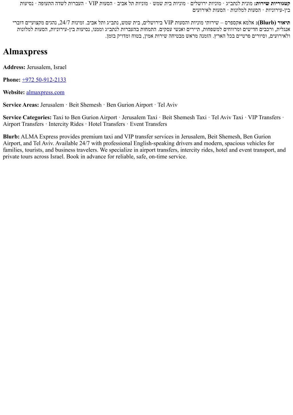 תועיסנ · הפועתה הדשל תורבעה · VIP תועסה · ביבא לת תוינומ · שמש תיב תוינומ · םילשורי תוינומ · ג״בתנל תינומ :תוריש תוירוגטק םיעוריאל תועסה · תונולמל תועסה · תוינוריע-ןיב ירבוד םייעוצקמ םיגהנ ,24/7 תונימז .ביבא לתו ג״בתנ ,שמש תיב ,םילשוריב VIP תועסהו תוינומ יתוריש – סרפסקא אמלא :(Blurb) רואית תונולמל תועסה ,תוינוריע-ןיב תועיסנ ,ונממו ג״בתנל תורבעהב תוחמתה .םיקסע ישנאו םיריית ,תוחפשמל םיחוורמו םישידח םיבכרו ,תילגנא .ןמזב קיודמו חוטב ,ןימא תוריש החיטבמ שארמ הנמזה .ץראה לכב םייטרפ םירויסו ,םיעוריאלו Almaxpress Address: Jerusalem, Israel Phone:+972 50-912-2133 Website:almaxpress.com Service Areas: Jerusalem · Beit Shemesh · Ben Gurion Airport · Tel Aviv Service Categories: Taxi to Ben Gurion Airport · Jerusalem Taxi · Beit Shemesh Taxi · Tel Aviv Taxi · VIP Transfers · Airport Transfers · Intercity Rides · Hotel Transfers · Event Transfers Blurb: ALMA Express provides premium taxi and VIP transfer services in Jerusalem, Beit Shemesh, Ben Gurion Airport, and Tel Aviv. Available 24/7 with professional English-speaking drivers and modern, spacious vehicles for families, tourists, and business travelers. We specialize in airport transfers, intercity rides, hotel and event transport, and private tours across Israel. Book in advance for reliable, safe, on-time service.