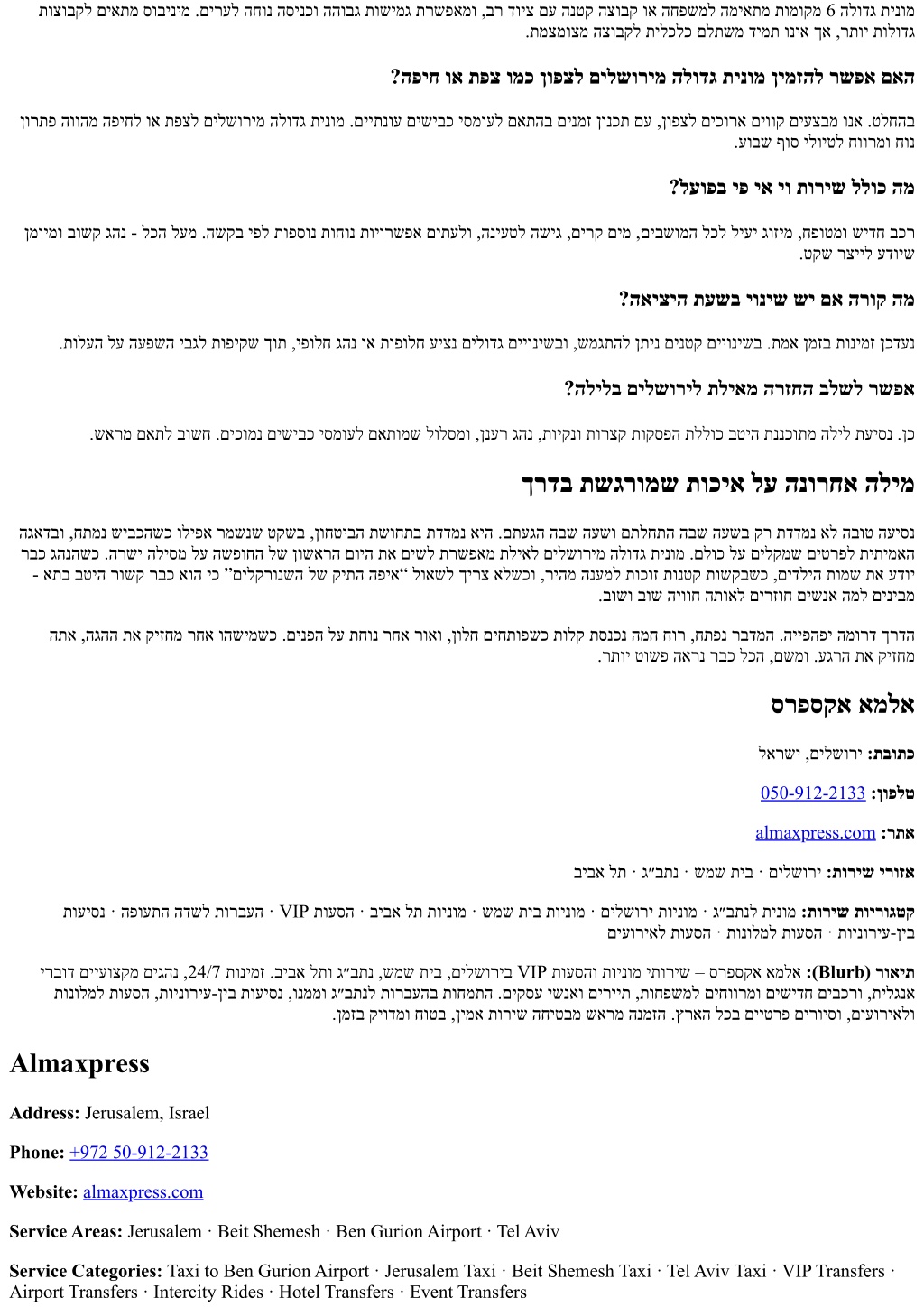 Blurb: ALMA Express provides premium taxi and VIP transfer services in Jerusalem, Beit Shemesh, Ben Gurion Airport, and Tel Aviv. Available 24/7 with professional English-speaking drivers and modern, spacious vehicles for families, tourists, and business travelers. We specialize in airport transfers, intercity rides, hotel and event transport, and private tours across Israel. Book in advance for reliable, safe, on-time service.