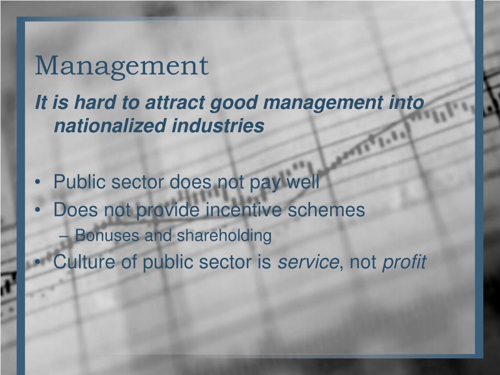 Management It is hard to attract good management into nationalized industries • Public sector does not pay well • Does not provide incentive schemes • Bonuses and shareholding • Culture of public sector is service, not profit