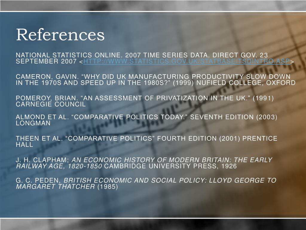 References National Statistics Online. 2007 Time Series Data. Direct Gov. 23 September 2007 <http://www.statistics.gov.uk/statbase/tsdintro.asp> Cameron, Gavin. “Why did UK manufacturing productivity slow down in the 1970s and speed up in the 1980s?” (1999) Nufield College, Oxford Pomeroy, Brian. “An assessment of privatization in the UK.” (1991) Carnegie Council Almond et al. “Comparative Politics Today.” Seventh Edition (2003) Longman Theen et al. “Comparative Politics” Fourth Edition (2001) Prentice Hall J. H. Clapham; An Economic History of Modern Britain: The Early Railway Age, 1820-1850 Cambridge University Press, 1926 G. C. Peden, British Economic and Social Policy: Lloyd George to Margaret Thatcher (1985)