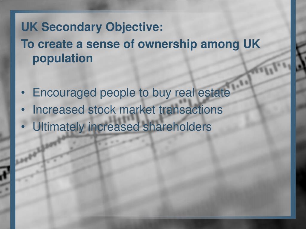 UK Secondary Objective: To create a sense of ownership among UK population • Encouraged people to buy real estate • Increased stock market transactions • Ultimately increased shareholders