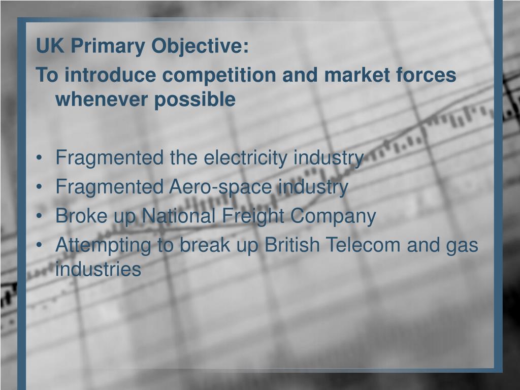 UK Primary Objective: To introduce competition and market forces whenever possible • Fragmented the electricity industry • Fragmented Aero-space industry • Broke up National Freight Company • Attempting to break up British Telecom and gas industries