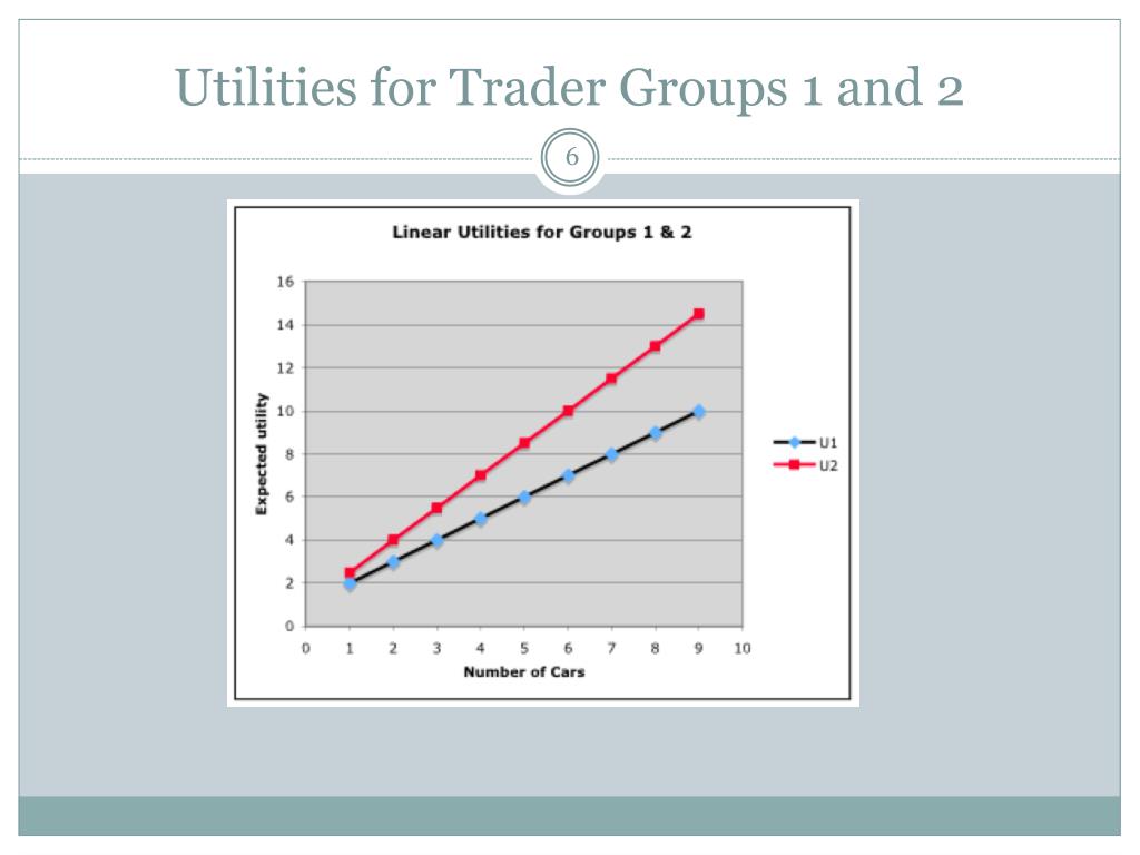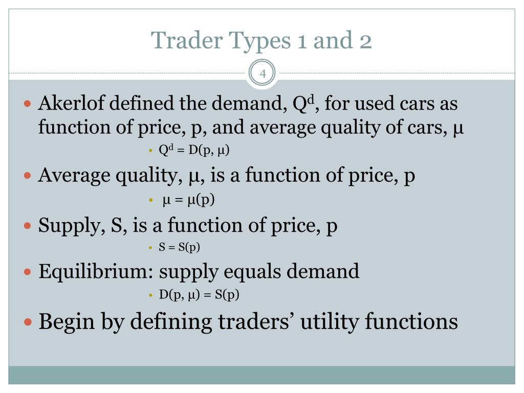 Trader Types 1 and 2 • Akerlof defined the demand, Qd, for used cars as function of price, p, and average quality of cars, μ • Qd = D(p, μ) • Average quality, μ, is a function of price, p • μ = μ(p) • Supply, S, is a function of price, p • S = S(p) • Equilibrium: supply equals demand • D(p, μ) = S(p) • Begin by defining traders’ utility functions