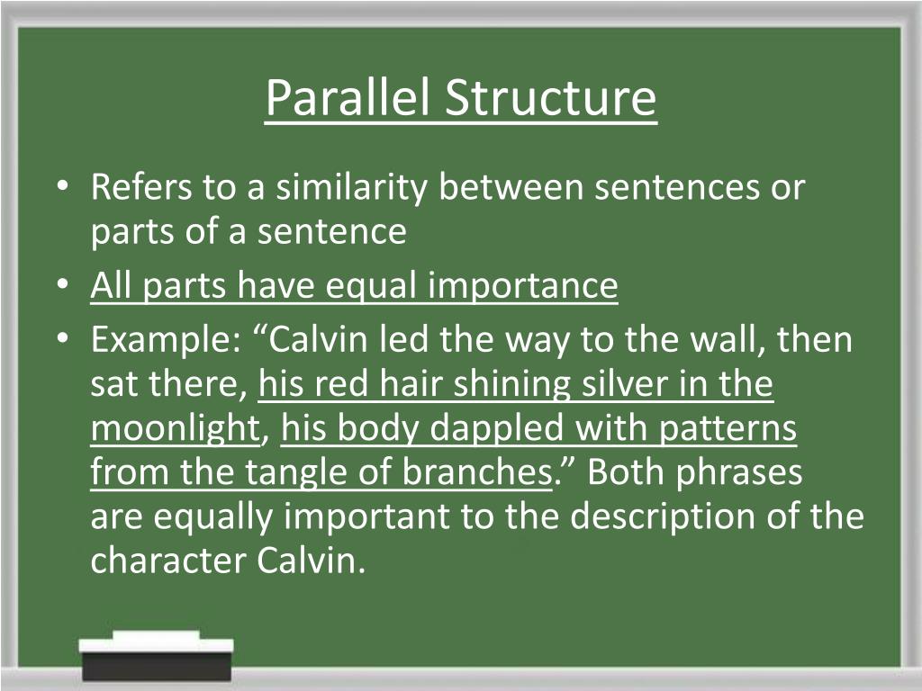 Parallel Structure • Refers to a similarity between sentences or parts of a sentence • All parts have equal importance • Example: “Calvin led the way to the wall, then sat there, his red hair shining silver in the moonlight, his body dappled with patterns from the tangle of branches.” Both phrases are equally important to the description of the character Calvin.