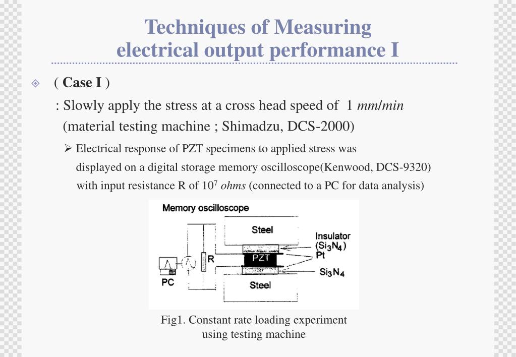 Techniques of Measuring electrical output performance I • ( Case I ) : Slowly apply the stress at a cross head speed of 1 mm/min (material testing machine ; Shimadzu, DCS-2000) • Electrical response of PZT specimens to applied stress was displayed on a digital storage memory oscilloscope(Kenwood, DCS-9320) with input resistance R of 107ohms (connected to a PC for data analysis) Fig1. Constant rate loading experiment using testing machine