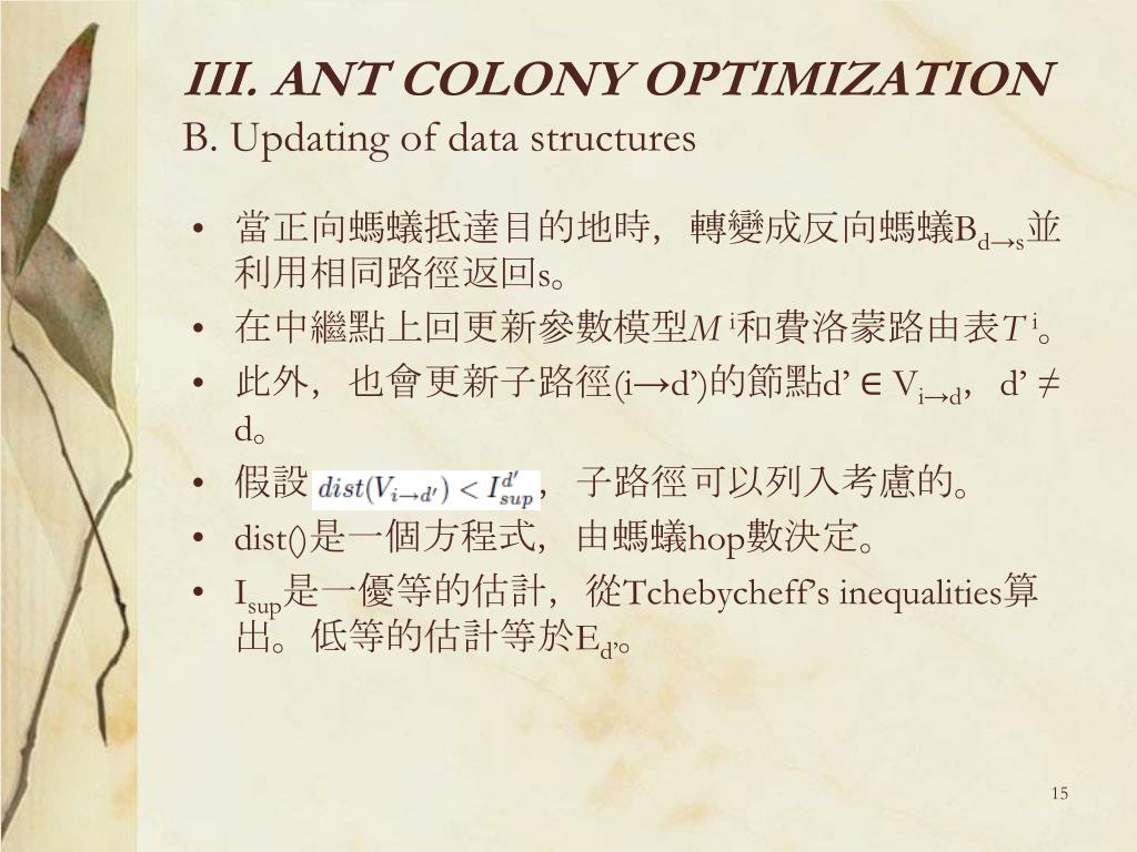 III. ANT COLONYOPTIMIZATION 和 會由指數模型[30]來更新其值: :新觀察值 η:指數模型的因素 窗口值w = 5(c/η),where c ∈ (0, 1],更新跳動就不會太大。 • 模型M維持所有節點的評估,費洛蒙表T給較好的下一hop往目的地。