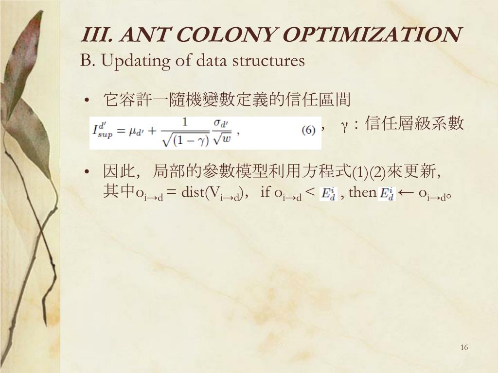 III. ANT COLONYOPTIMIZATIONB. Updating of data structures • 它容許一隨機變數定義的信任區間 , γ:信任層級系數 • 因此,局部的參數模型利用方程式(1)(2)來更新,其中oi→d= dist(Vi→d),if oi→d< , then ← oi→d。