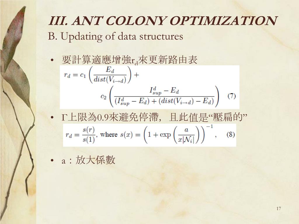 III. ANT COLONYOPTIMIZATIONB. Updating of data structures • 要計算適應增強rd來更新路由表 • Γ上限為0.9來避免停滯,且此值是“壓扁的” • a:放大係數