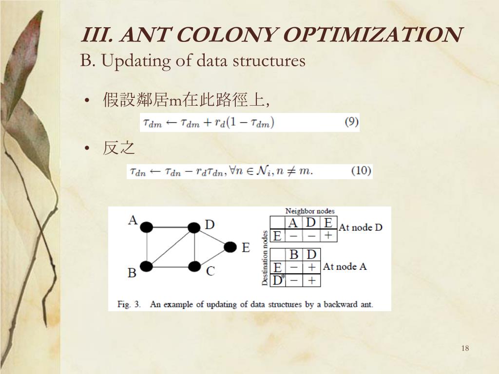 III. ANT COLONYOPTIMIZATIONB. Updating of data structures • 假設鄰居m在此路徑上, • 反之