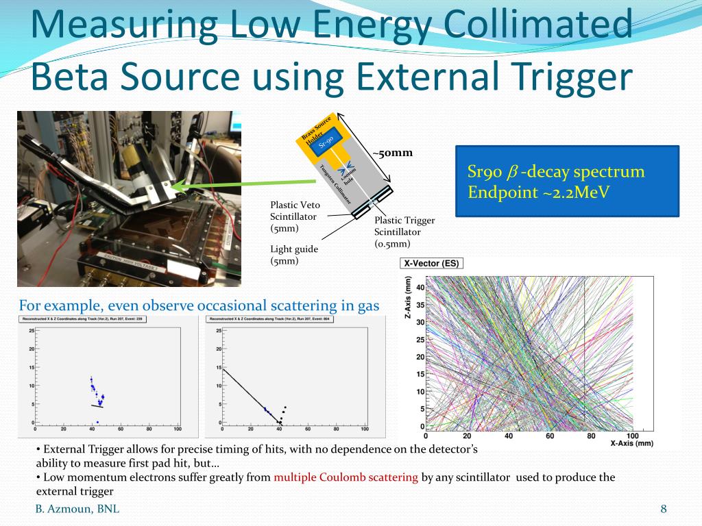Brass Source Holder Measuring Low Energy Collimated Beta Source using External Trigger Sr-90 ~50mm 1.00mm hole Tungsten Collimator Sr90 b -decay spectrum Endpoint ~2.2MeV Plastic Veto Scintillator (5mm) For example, even observe occasional scattering in gas Plastic Trigger Scintillator (0.5mm) Light guide (5mm) • External Trigger allows for precise timing of hits, with no dependence on the detector’s • ability to measure first pad hit, but… • Low momentum electrons suffer greatly from multiple Coulomb scattering by any scintillator used to produce the external trigger