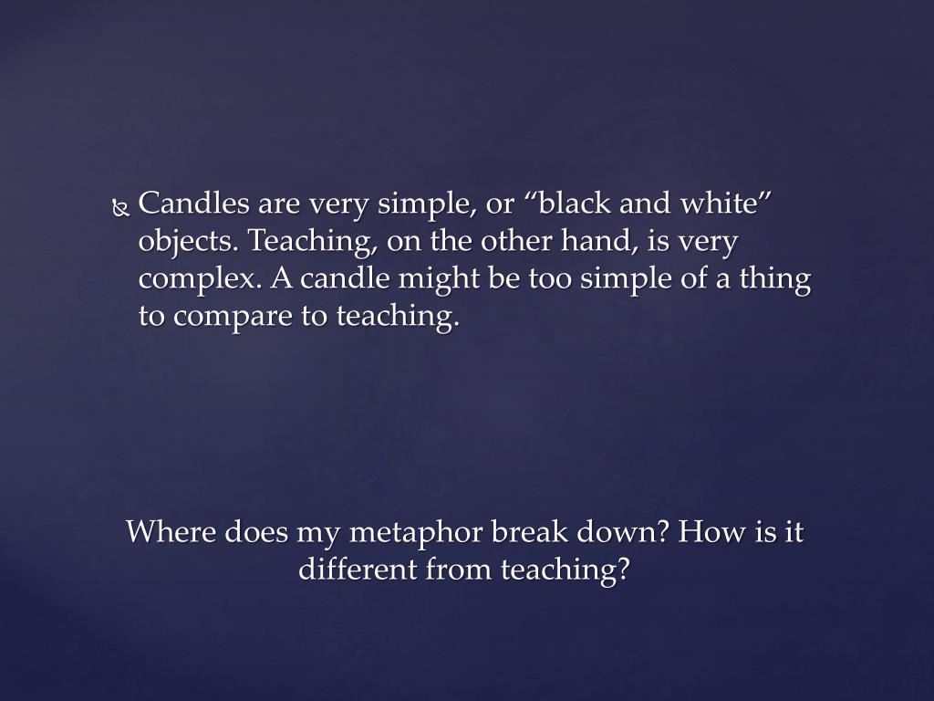 Candles are very simple,or “black and white” objects. Teaching, on the other hand, is very complex. A candle might be too simple of a thing to compare to teaching. Where does my metaphor break down? How is it different from teaching?