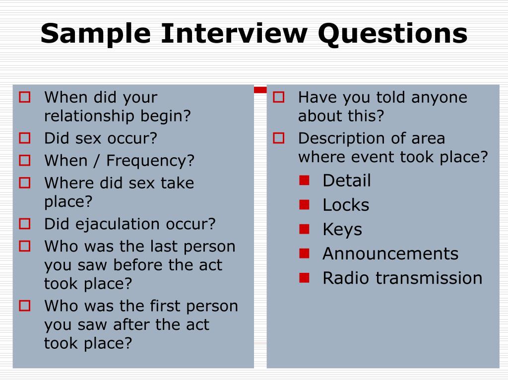 When did your relationship begin? Did sex occur? When / Frequency? Where did sex take place? Did ejaculation occur? Who was the last person you saw before the act took place? Who was the first person you saw after the act took place? Have you told anyone about this? Description of area where event took place? Detail Locks Keys Announcements Radio transmission Sample Interview Questions
