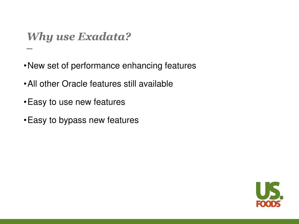 Why use Exadata? New set of performance enhancing features All other Oracle features still available Easy to use new features Easy to bypass new features