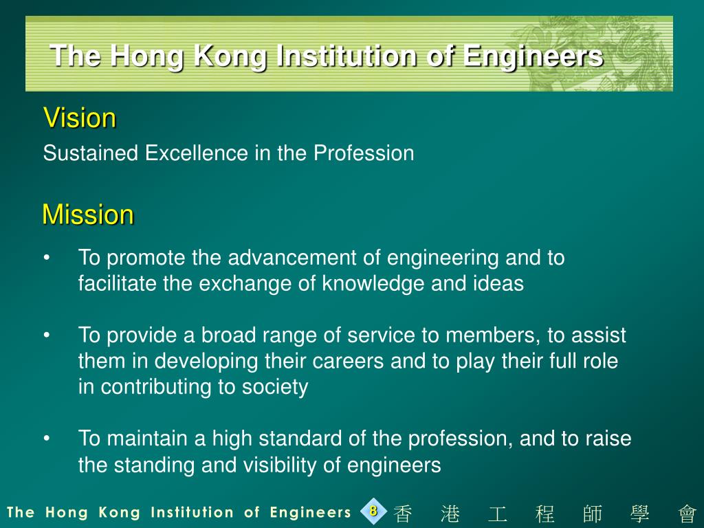 The Hong Kong Institution of Engineers Vision Sustained Excellence in the Profession Mission • To promote the advancement of engineering and to facilitate the exchange of knowledge and ideas • To provide a broad range of service to members, to assist them in developing their careers and to play their full role in contributing to society • To maintain a high standard of the profession, and to raise the standing and visibility of engineers
