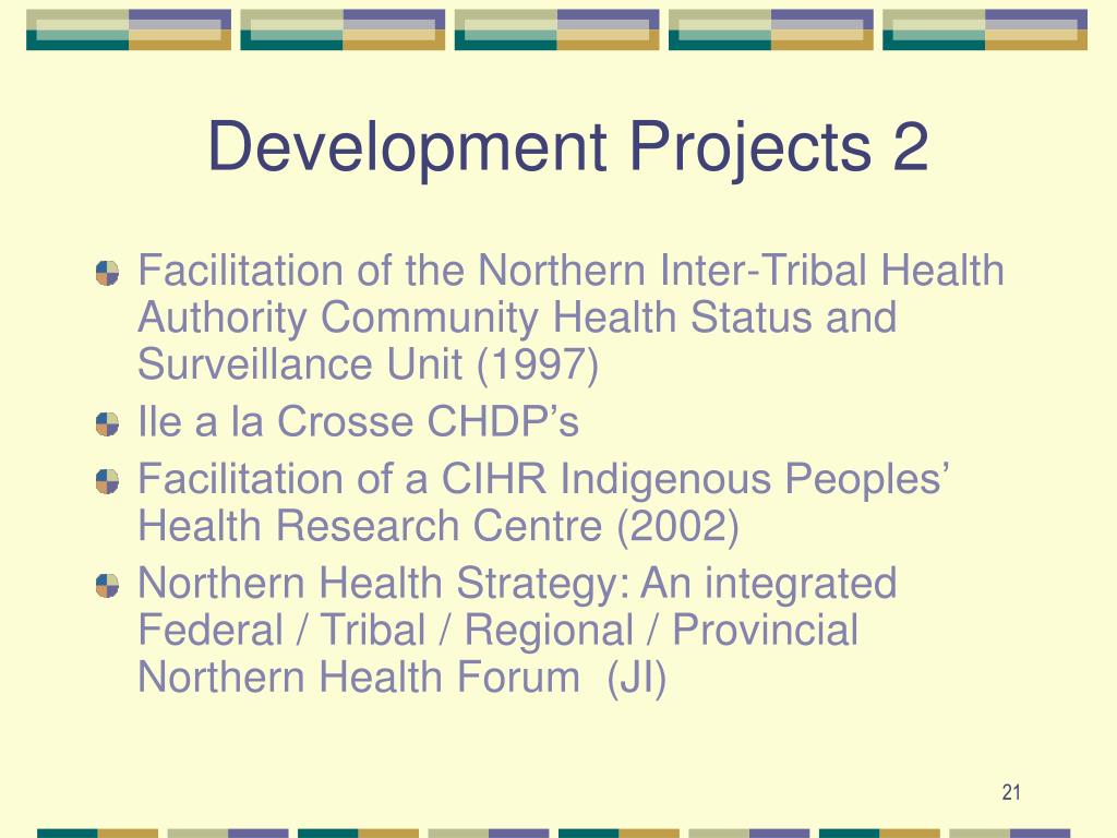 Development Projects 1 • Primary Health Services: Integration & Evaluation (1999) • Integrated Provincial & Federal Evidence Based ACN / PCN Formulary • CDA CPG Diabetes Tracking Sheets (2000) • Formalized Aboriginal Health Research Ethical Guidelines for Northern Saskatchewan