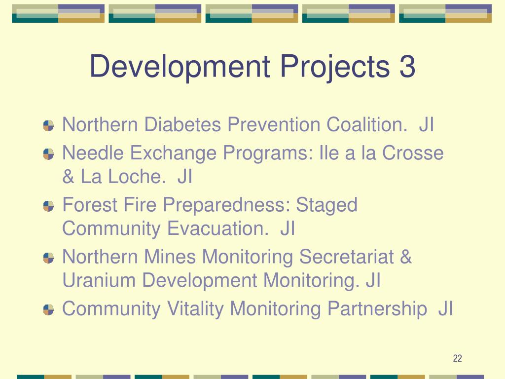 Development Projects 3 • Northern Diabetes Prevention Coalition. JI • Needle Exchange Programs: Ile a la Crosse & La Loche. JI • Forest Fire Preparedness: Staged Community Evacuation. JI • Northern Mines Monitoring Secretariat & Uranium Development Monitoring. JI • Community Vitality Monitoring Partnership JI