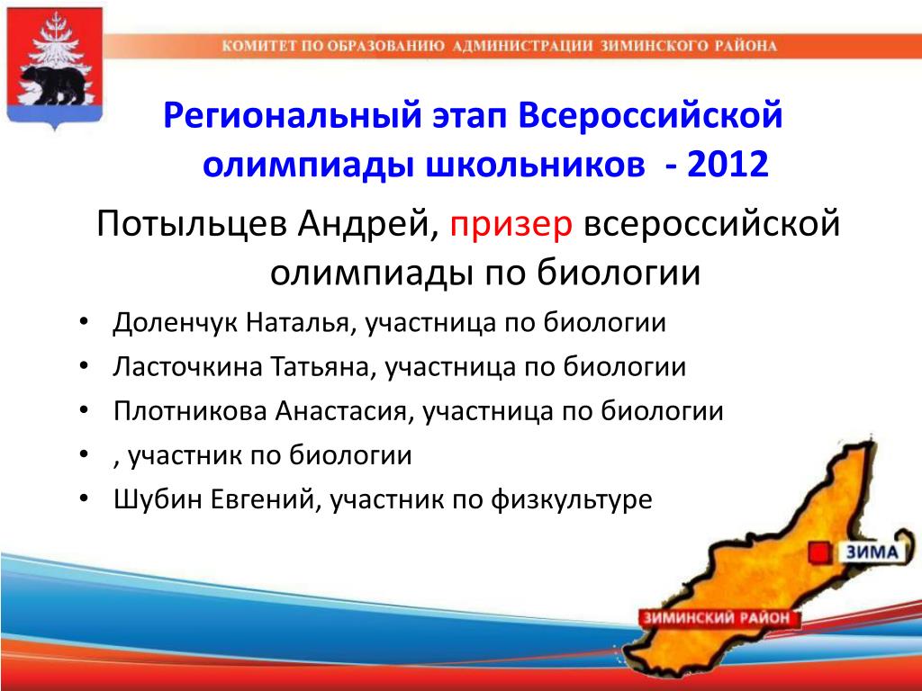 Региональный этап Всероссийской олимпиады школьников - 2012 Потыльцев Андрей, призер всероссийской олимпиады по биологии • Доленчук Наталья, участница по биологии • Ласточкина Татьяна, участница по биологии • Плотникова Анастасия, участница по биологии • , участник по биологии • Шубин Евгений, участник по физкультуре