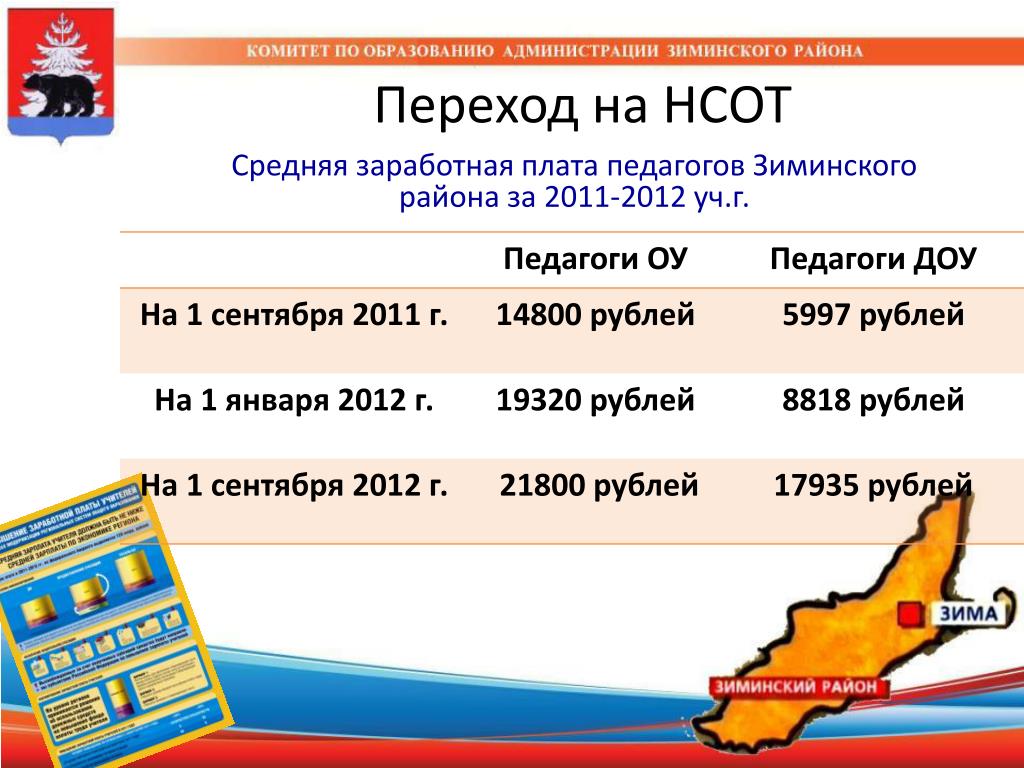 Переход на НСОТ Средняя заработная плата педагогов Зиминского района за 2011-2012 уч.г.
