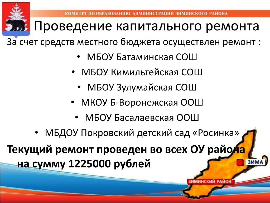 Проведение капитального ремонта За счет средств местного бюджета осуществлен ремонт : • МБОУ Батаминская СОШ • МБОУ Кимильтейская СОШ • МБОУ Зулумайская СОШ • МКОУ Б-Воронежская ООШ • МБОУ Басалаевская ООШ • МБДОУ Покровский детский сад «Росинка» Текущий ремонт проведен во всех ОУ района на сумму 1225000 рублей