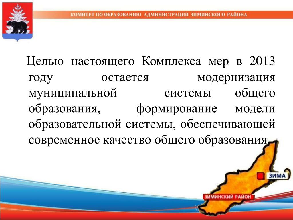 Целью настоящего Комплекса мер в 2013 году остается модернизация муниципальной системы общего образования, формирование модели образовательной системы, обеспечивающей современное качество общего образования.
