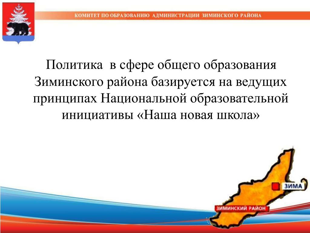 Политика в сфере общего образования Зиминского района базируется на ведущих принципах Национальной образовательной инициативы «Наша новая школа»