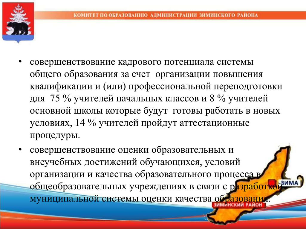совершенствование кадрового потенциала системы общего образования за счет организации повышения квалификации и (или) профессиональной переподготовки для 75 % учителей начальных классов и 8 % учителей основной школы которые будут готовы работать в новых условиях, 14 % учителей пройдут аттестационные процедуры. • совершенствование оценки образовательных и внеучебных достижений обучающихся, условий организации и качества образовательного процесса в общеобразовательных учреждениях в связи с разработкой муниципальной системы оценки качества образования.