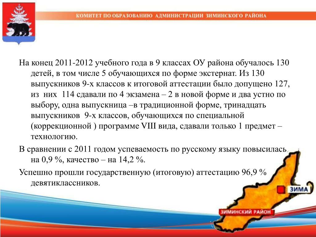 На конец 2011-2012 учебного года в 9 классах ОУ района обучалось 130 детей, в том числе 5 обучающихся по форме экстернат. Из 130 выпускников 9-х классов к итоговой аттестации было допущено 127, из них 114 сдавали по 4 экзамена – 2 в новой форме и два устно по выбору, одна выпускница –в традиционной форме, тринадцать выпускников 9-х классов, обучающихся по специальной (коррекционной ) программе VIII вида, сдавали только 1 предмет – технологию. В сравнении с 2011 годом успеваемость по русскому языку повысилась на 0,9 %, качество – на 14,2 %. Успешно прошли государственную (итоговую) аттестацию 96,9 % девятиклассников.