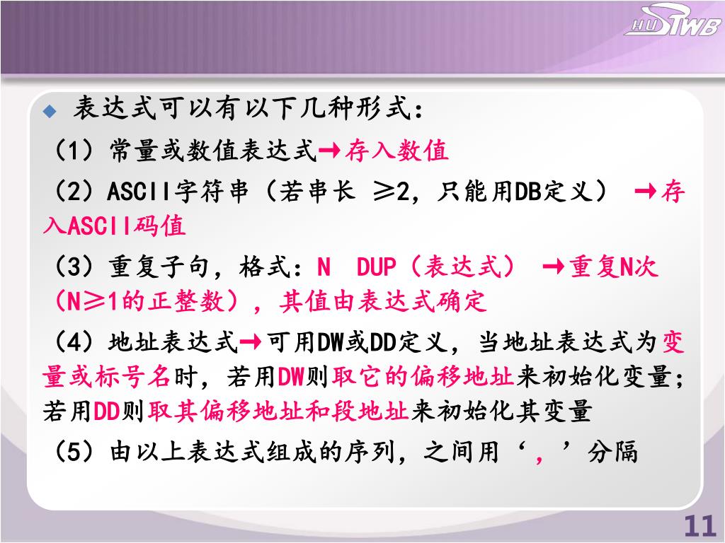 (1)常量或数值表达式→存入数值 (2)ASCII字符串(若串长 ≥2,只能用DB定义) →存入ASCII码值 (3)重复子句,格式:N DUP(表达式) →重复N次(N≥1的正整数),其值由表达式确定 (4)地址表达式→可用DW或DD定义,当地址表达式为变量或标号名时,若用DW则取它的偏移地址来初始化变量;若用DD则取其偏移地址和段地址来初始化其变量 (5)由以上表达式组成的序列,之间用‘ ,’分隔 • 表达式可以有以下几种形式: