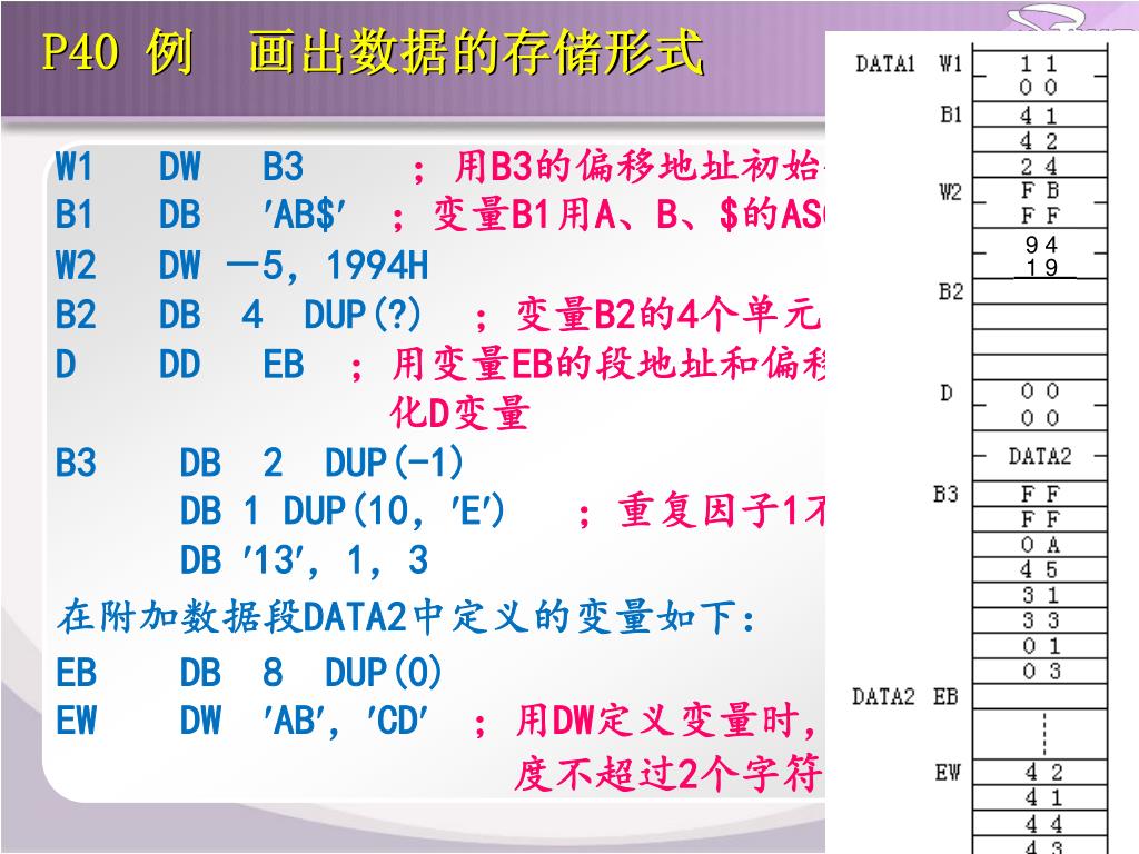 W1 DW B3 ;用B3的偏移地址初始化W1变量 B1 DB AB$;变量B1用A、B、$的ASCII码初始化 W2 DW -5,1994H B2 DB 4 DUP(?) ;变量B2的4个单元不初始化 D DD EB ;用变量EB的段地址和偏移地址初始 化D变量 B3 DB 2 DUP(-1) DB 1 DUP(10,E) ;重复因子1不能省 DB 13,1,3 在附加数据段DATA2中定义的变量如下: EB DB 8 DUP(0) EW DW AB,CD;用DW定义变量时,字符串长 度不超过2个字符 P40 例 画出数据的存储形式 9 4 1 9