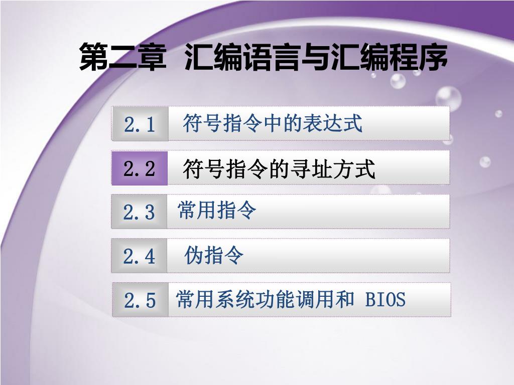 第二章 汇编语言与汇编程序 2.1 符号指令中的表达式 2.2 符号指令的寻址方式 2.3 常用指令 2.4 伪指令 2.5 常用系统功能调用和 BIOS
