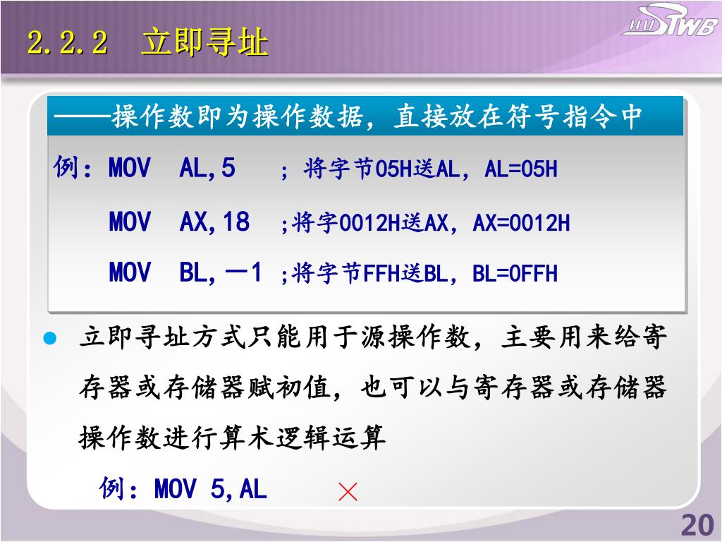 ——操作数即为操作数据,直接放在符号指令中——操作数即为操作数据,直接放在符号指令中 2.2.2 立即寻址 例:MOV AL,5 ; 将字节05H送AL,AL=05H MOV AX,18 ;将字0012H送AX,AX=0012H MOV BL,-1 ;将字节FFH送BL,BL=0FFH • 立即寻址方式只能用于源操作数,主要用来给寄存器或存储器赋初值,也可以与寄存器或存储器操作数进行算术逻辑运算 • 例:MOV 5,AL ╳