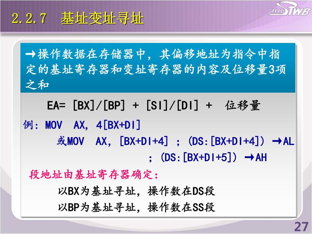 2.2.7 基址变址寻址 →操作数据在存储器中,其偏移地址为指令中指定的基址寄存器和变址寄存器的内容及位移量3项之和 EA= [BX]/[BP] + [SI]/[DI] + 位移量 例: MOV AX, 4[BX+DI]或MOV AX,[BX+DI+4] ;(DS:[BX+DI+4]) →AL ;(DS:[BX+DI+5]) →AH 段地址由基址寄存器确定: 以BX为基址寻址,操作数在DS段 以BP为基址寻址,操作数在SS段