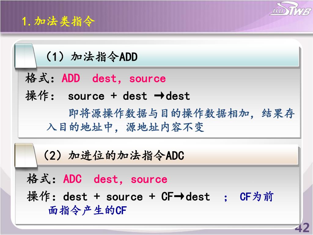 (1)加法指令ADD 1.加法类指令 格式:ADD dest,source 操作: source + dest →dest 即将源操作数据与目的操作数据相加,结果存入目的地址中,源地址内容不变 (2)加进位的加法指令ADC 格式:ADC dest,source 操作:dest + source + CF→dest; CF为前面指令产生的CF