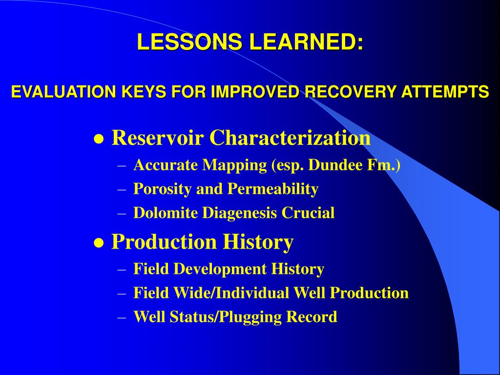 LESSONS LEARNED:EVALUATION KEYS FOR IMPROVED RECOVERY ATTEMPTS • Reservoir Characterization • Accurate Mapping (esp. Dundee Fm.) • Porosity and Permeability • Dolomite Diagenesis Crucial • Production History • Field Development History • Field Wide/Individual Well Production • Well Status/Plugging Record